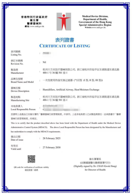 2025年2月28日,杭州川方至医疗器械有限公司在香港取得“一次性使用呼吸过滤器”产品的注册许可。